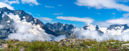 Panoramic view of snowcapped Arkhyz mountains in Karachay-Cherkessia (Russia)