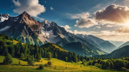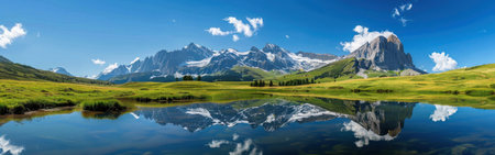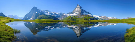 A breathtaking panoramic view of snow-capped mountains reflected in a still lake, with a lush green meadow in the foreground. The sky is a bright blue, and the sun is shining brightly. This serene landscape is a testament to the beauty of nature.