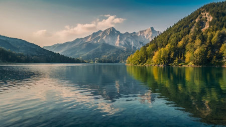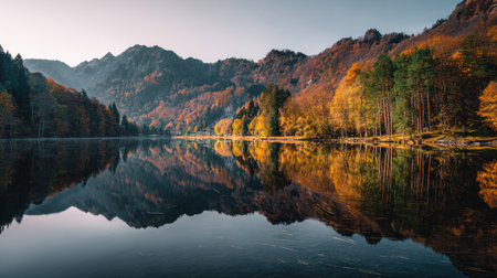 Tranquil lake in the Alps with mountains on a background in the morning in autumn