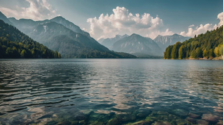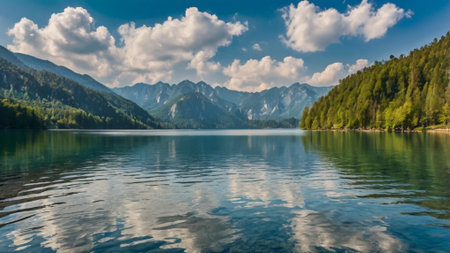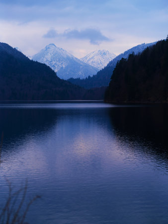 Lake Alpsee, near Hohenschwangau castle, in Bavaria state, with surrounding nature landscape and mountains, Germany, under cloudy blue sky