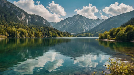 Beautiful alpine lake with clear water and green mountains in background