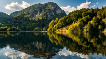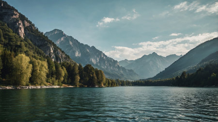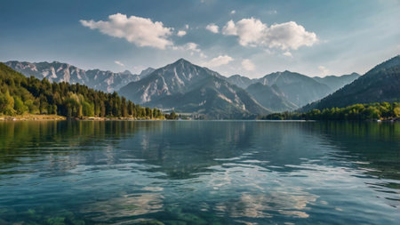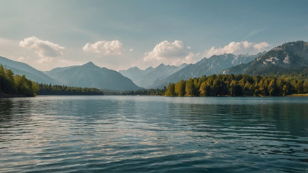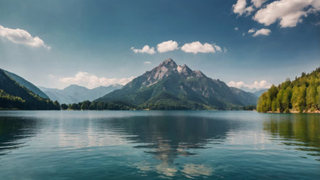 A tranquil lake scene surrounded by majestic mountains and lush greenery, perfect for nature lovers and travel enthusiasts seeking peaceful landscapes.