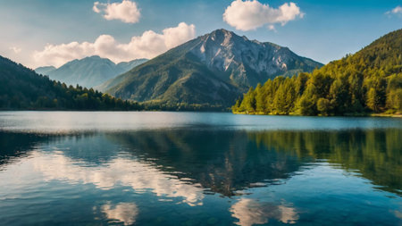 Idyllic alpine landscape with lake and mountains reflected in water