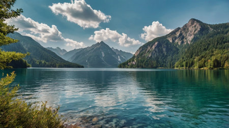 A lake surrounded by mountains with a blue sky, AI