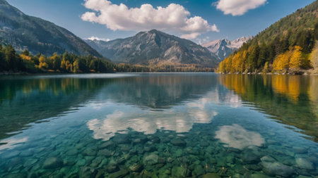 Autumn alpine landscape with lake and mountains reflected in the water