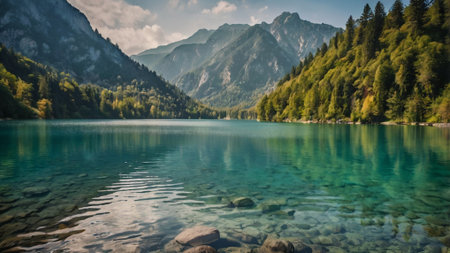 Beautiful alpine lake with crystal clear water and high mountains in background