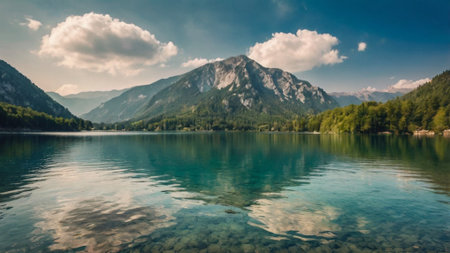 Idyllic alpine landscape with lake and mountains in the background
