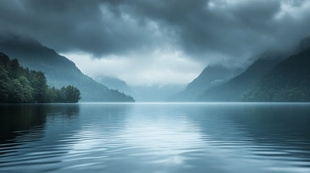 A serene lake surrounded by mountains and lush forests, reflecting the sky and trees.