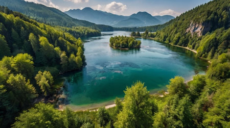 Aerial view of beautiful alpine lake with turquoise water and forest