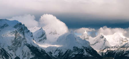 Snowy mountains with severe rocky peaks in Dombay, Caucasus, Karachay-Cherkessia, Russia.