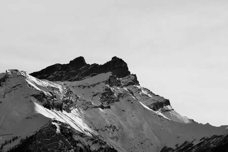 Panoramic view on snowy slope in high winter mountains and sunlit cloudy sky. Italian Alps. Livigno, region of Lombardy, Italy, Europe. Black and white toned landscape.