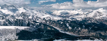 Panoramic view of mountains ridge in Karachay-Cherkess Republic in Russia at sunny winter day