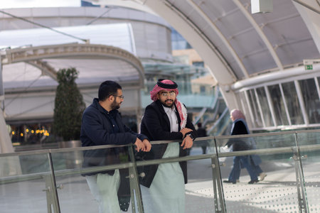 two arabian business men discuss and walk together around modern city