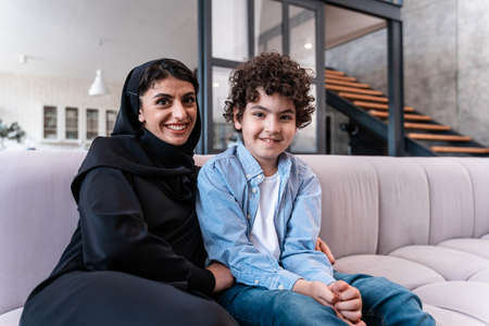 Middle eastern family portrait single mother with teenage kids at home in living room. Selective focus