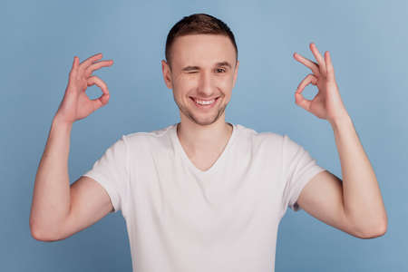 Close up photo of attractive guy holding hands showing okey symbols wink eye isolated blue color background