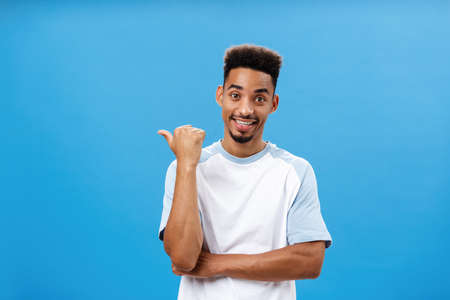 Attractive skillful coworker indicating at friend who can solve situation standing relaxed and carefree over blue background pointing left or backwards with thumb and smiling while casually talking