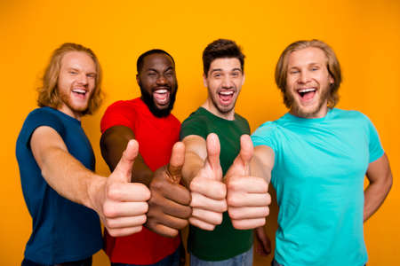 Portrait of energetic fellows four man enjoy great ideal perfect sale ads promotion show thumb up wear t-shirt isolated over shine color background