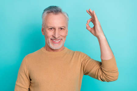 Portrait of handsome cheerful man arm fingers demonstrate okey symbol isolated on turquoise color background