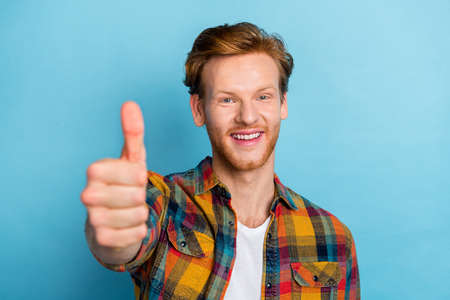 Close-up portrait of enthusiastic handsome young teenage guy, college student recommend awesome courses, online education school, show thumbs-up as recommending, like and approve, smiling