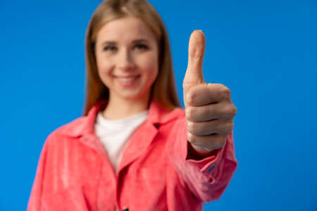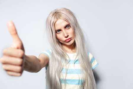 Studio portrait of blonde pretty girl showing thumb up on white background.