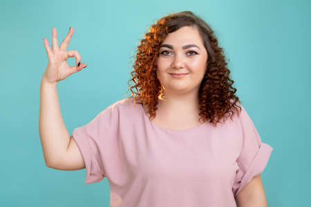 Body positive. Fatty woman. Supportive gesture. Healthy diet. Calorie intake. Conceptual portrait. Smiling plus size lady showing ok sign looking at camera isolated blue.