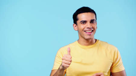 Handsome korean man shows thumbs up, Like gesture. Happy asian guy on blue background. Winner. Success. Positive male model smiles to camera. Body language.