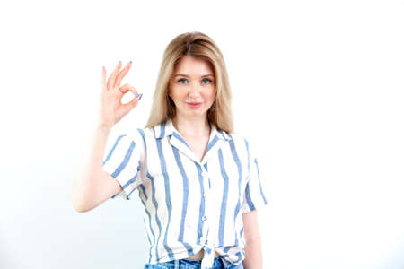 Close up portrait of a pretty young woman winking. Cute funny lady making winks. Woman isolated on white background showing ok sign with fingers. Funny young girl showing OK gesture.