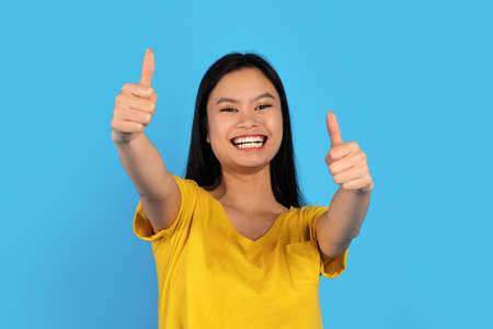 Portrait of happy young asian lady with down syndrome in yellow t-shirt showing thumbs up on blue background