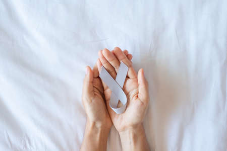 Brain Cancer Awareness month, woman hand holding grey color Ribbon for supporting people living. Healthcare and World cancer day concept