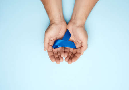 Blue ribbon symbol of colon or prostate cancer in hands. Medical support and prevention.