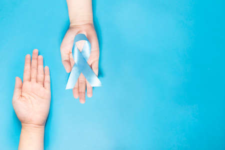Men's health and Prostate cancer awareness campaign concept. Human hands giving light blue ribbon awareness symbol for help and support men who living w/ cancer on sky blue background. Copy space.