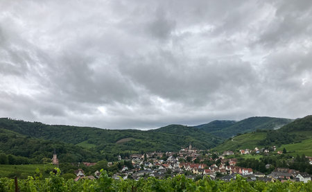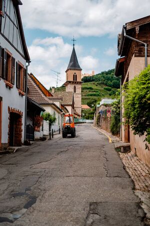 Rorschwihr, France - Apr 19, 2019: Large view entrance from the main highway to the Rorschwihr village in Alsace with mountains and church in background