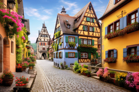 Ornate traditional half timbered houses with blooming flowers in a popular village on the Alsatian Wine Route in Eguisheim, France