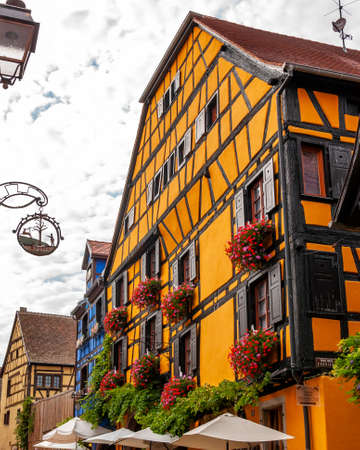 ALSACE WINE REGION, FRANCE - SEP 19, 2019: Typical house and restaurant in Kaysersberg village which is located on Alsatian Wine Route, France.