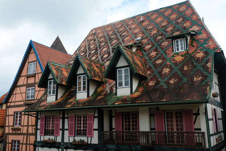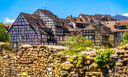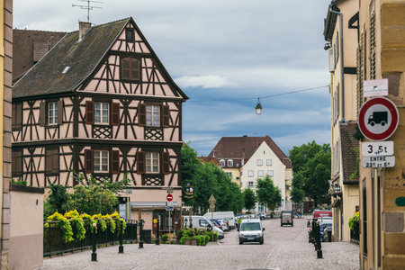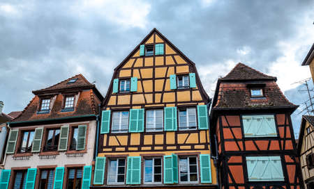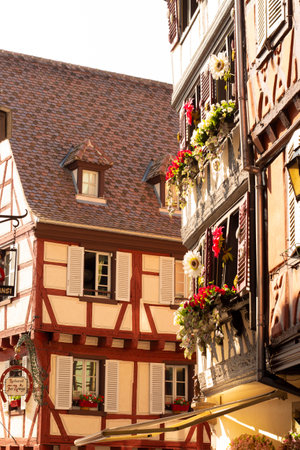 Colmar. France. May 22, 2023. Beautiful French city in Alsace. Colorful wooden building facades with windows. Traditional old architecture. Sunny summer day.