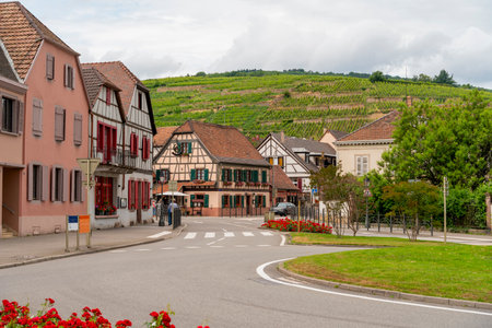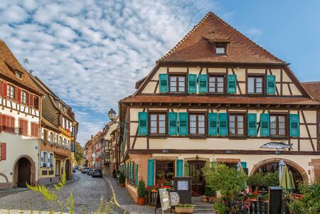 Old colorful houses in Kientzheim village on Alsatian Wine Route, France