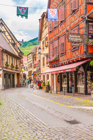 18 June 2012. Ribeauvillé village with colorful traditional half-timbered french houses, Alsace, France