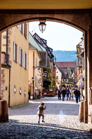 Riquewihr, France - April 27, 2017 : Girl running walking in street with half-timbered houses on a sunny day, with the ornate buildings and statues in the background.