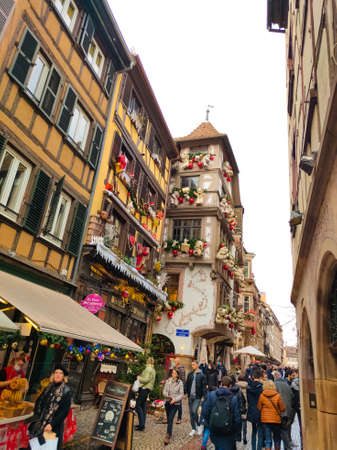 Festive decorations and ornaments on historic half timbered houses during the Christmas Market in the Little Venice Old Town of Colmar, Alsace, France