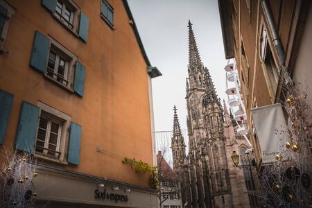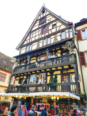 Strasbourg, Alsace, France - December 30, 2021: Streets and facades of houses, traditionally decorated with toys and teddy bears for Christmas in medieval city of Strasbourg - the capital of Christmas