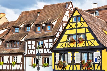 Colmar, France - October 24, 2021: Facades of traditional Alsatian half-timbered houses in Little Venice tourist district of Colmar old town, Haut-Rhin department, Grand Est region of northeastern Fra
