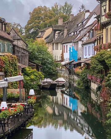 View with colorful buildings, streets and flowers. Colmar, France. Petite Venice, water canal and traditional half timbered houses.
