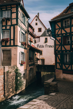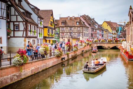 COLMAR, FRANCE - September 10, 2017: Cityscaspe view on the old town with beautiful half-timbered houses and water canal in Colmar, famous french town in Alsace region