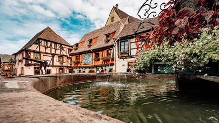Streets of Eguisheim in Alsace, France, with traditional houses and colored facades