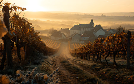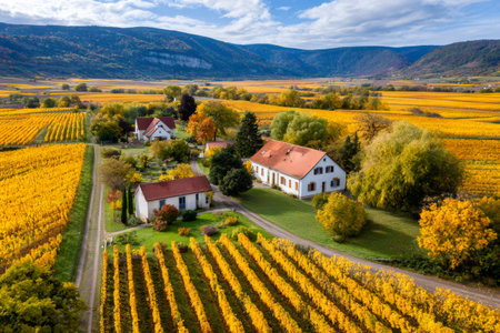 Rolling vineyard landscape featuring rural houses surrounded by golden rows of grapevines during autumn