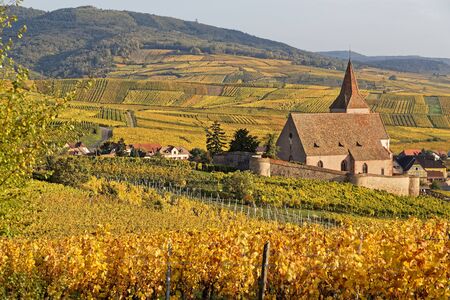 Fortified church of the Alsatian village of Hunawihr, surrounded by vineyards, with beautiful yellow autumn colours