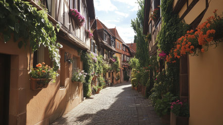 A quaint street in Colmar, Alsace, lined with half-timbered houses and flower boxes.