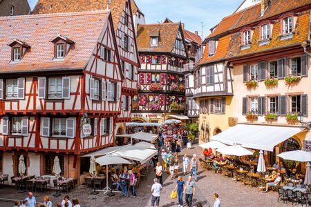 COLMAR, FRANCE - September 10, 2017: Cityscaspe view on the old town with beautiful half-timbered houses and crowded streets in Colmar, famous french town in Alsace region