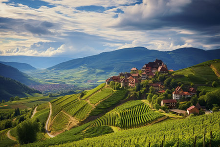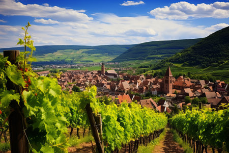 A Picturesque Panorama: The Breathtaking View of Riquewihr Village, France, from Atop the Vineyard Hill