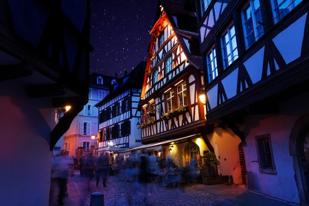 Strasbourg, Alsace, France - December 12, 2016: Streets and facades of houses, traditionally decorated with toys and teddy bears for Christmas in medieval city of Strasbourg - the capital of Christmas